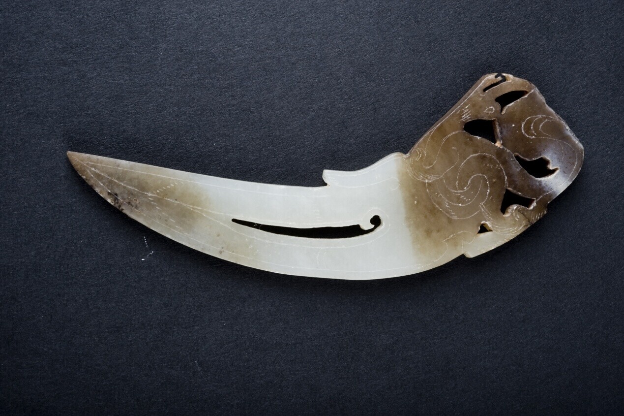 萧王庄墓群一号汉墓出土的一级文物。玉觿长9.7厘米,最宽2.6厘米,厚0.4厘米,弧形扁角状,白玉质,两端呈褐色,通体光滑,两面雕琢纹饰,较宽的一端正面饰一螭虎,背面饰一凤鸟,螭尾回首,凤鸟张口,二者首、颈部透雕可供穿系,身、尾部浅浮雕成卷曲状,其上再饰以阴线纹。器身中部镂孔,正面边缘阴刻竹节状纹,尾部尖锐。