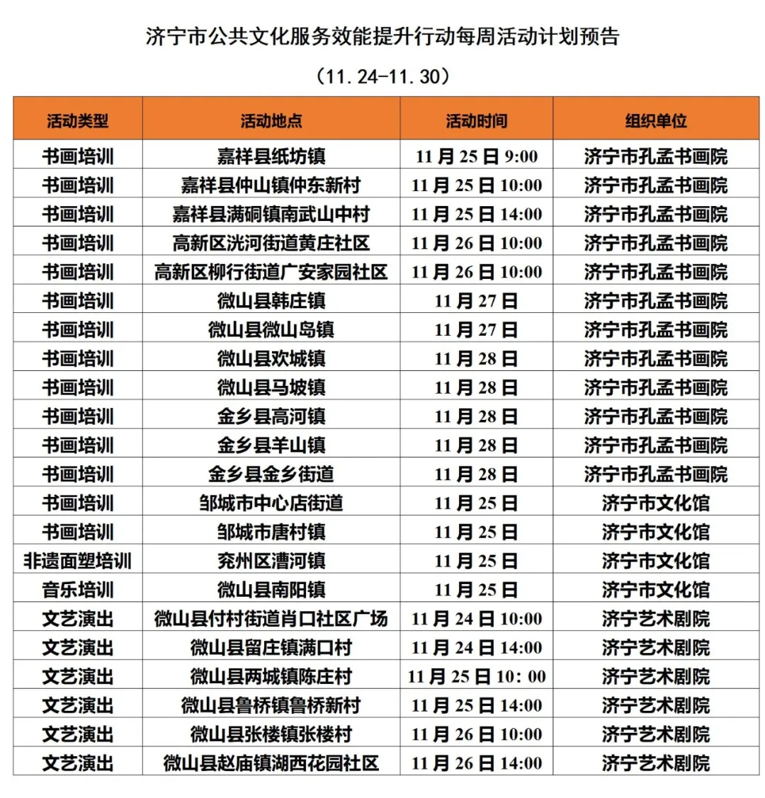 本周,市孔孟书画院、市文化馆、市山东梆子剧院、济宁艺术剧院等市直文化单位(院团)将携手联动,准备精彩文艺节目及品质文化辅导课程深入全市22个乡镇(街道),用婉转唱腔、灵动舞姿与精品辅导课程为广大群众献上一场场接地气、有温度、聚人气的文化大餐。具体演出安排日程如下: