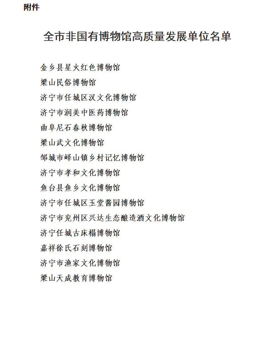 为推动“博物馆之城”建设,进一步促进非国有博物馆高质量发展,根据《博物馆条例》和《关于促进非国有博物馆发展的意见》《关于推动“博物馆之城”建设 促进博物馆事业高质量发展的实施意见》,济宁市文化和旅游局开展了全市非国有博物馆高质量发展培育行动。经各馆自愿参与、县级初审提报、市级专家审核和集中审议,现将拟认定的全市非国有博物馆高质量发展培育单位予以公示(见附件)。 公示期自2025年11月28日至12月4日。单位或个人对培育单位有异议的,可在公示期内以书面形式,实名向市文化和旅游局博物馆与社会文物科反映。反映情况须实事求是,并提供所反映问题的佐证材料。 联系电话:0537-2296610 电子邮箱:jnswljbwgk@163.com