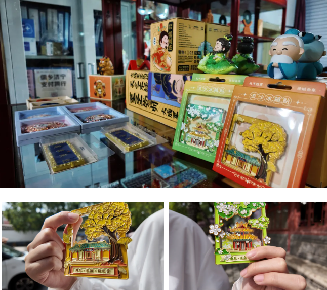 以孔庙内杏坛、诗礼堂为原型设计的“流沙冰箱贴”,今年暑期成了供不应求的“断货王”。这款爆品的创意藏着巧思,“灵感来自孔子杏坛讲学的经典场景,还有诗礼堂那棵千年银杏树。我们把杏色、金黄色的流沙封在金属冰箱贴里,一晃动流沙就流动起来,让静态的文物元素变得特别生动。”曲阜三孔文旅服务有限公司规划设计中心主任孔洋解释说。