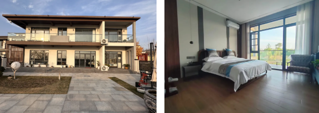 微山夕湖小筑民宿 夕湖小筑民宿位于微山岛镇沟南村,民宿面朝大湖,可观夕阳。民宿由上海亦境景观设计有限公司进行整体设计,占地面积300平方米,建筑面积420平方米,经营用客房面积200平方米,庭院面积210平方米。2024年5月建成营业,1栋2层7间(套),庭院大床房、湖景大床房、湖景双床房、亲子儿童房等共10张床位。民宿集精品住宿、游客服务、接待展示、特色餐饮、儿童游乐等于一体。