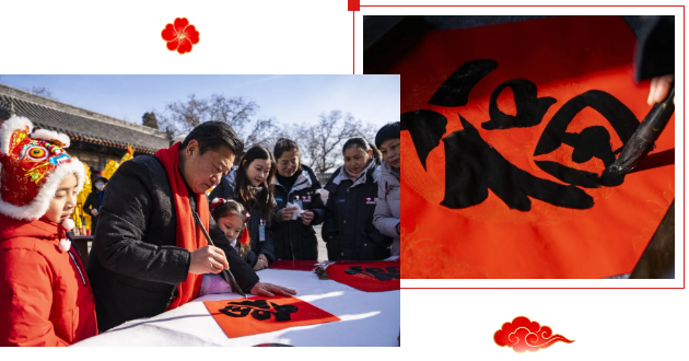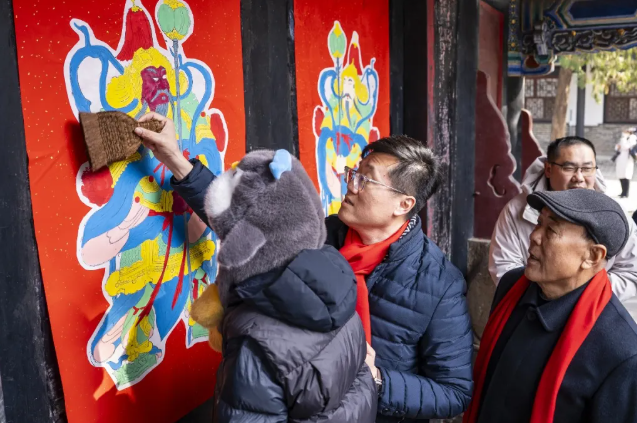 “孔府传承着中华民族最盛大、最完整的春节仪轨,是现存最古老的家庭过年模式的活态见证。”在孔府重光门前,孔子第七十六代孙、全国文明家庭代表孔令绍接过新书写的春联与新拓制的门神介绍道。祖孙三代现场演示张贴过程,不仅是对传统家礼的践行,更是优良家风与儒家文化代代相传的生动体现。孔令绍还与游客亲切交流,分享诗礼传家的故事,让深厚文化在互动中沁润人心。
