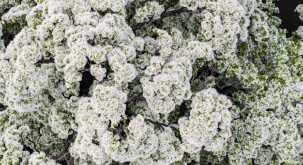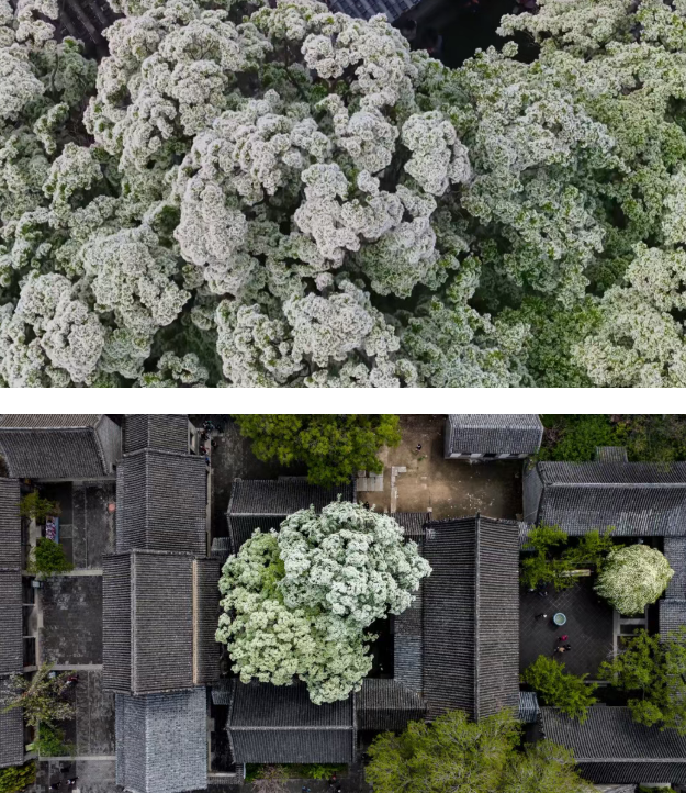 满树雪白 人称“四月雪” 花瓣纤细如丝 簇簇垂坠,远观似云端落雪覆满青瓦 近看如素纱轻扬,绕着朱门黛瓦