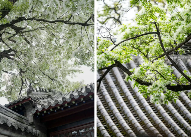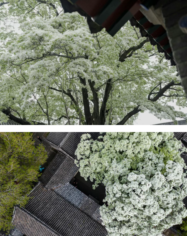 古建厚重,繁花清雅 百年流苏与千年儒风相融 绘就一幅诗意盎然的古卷 花期不过半月 这抹限定的 “四月雪” 是孟府独有的暮春浪漫 一眼千年 可抵岁月漫长