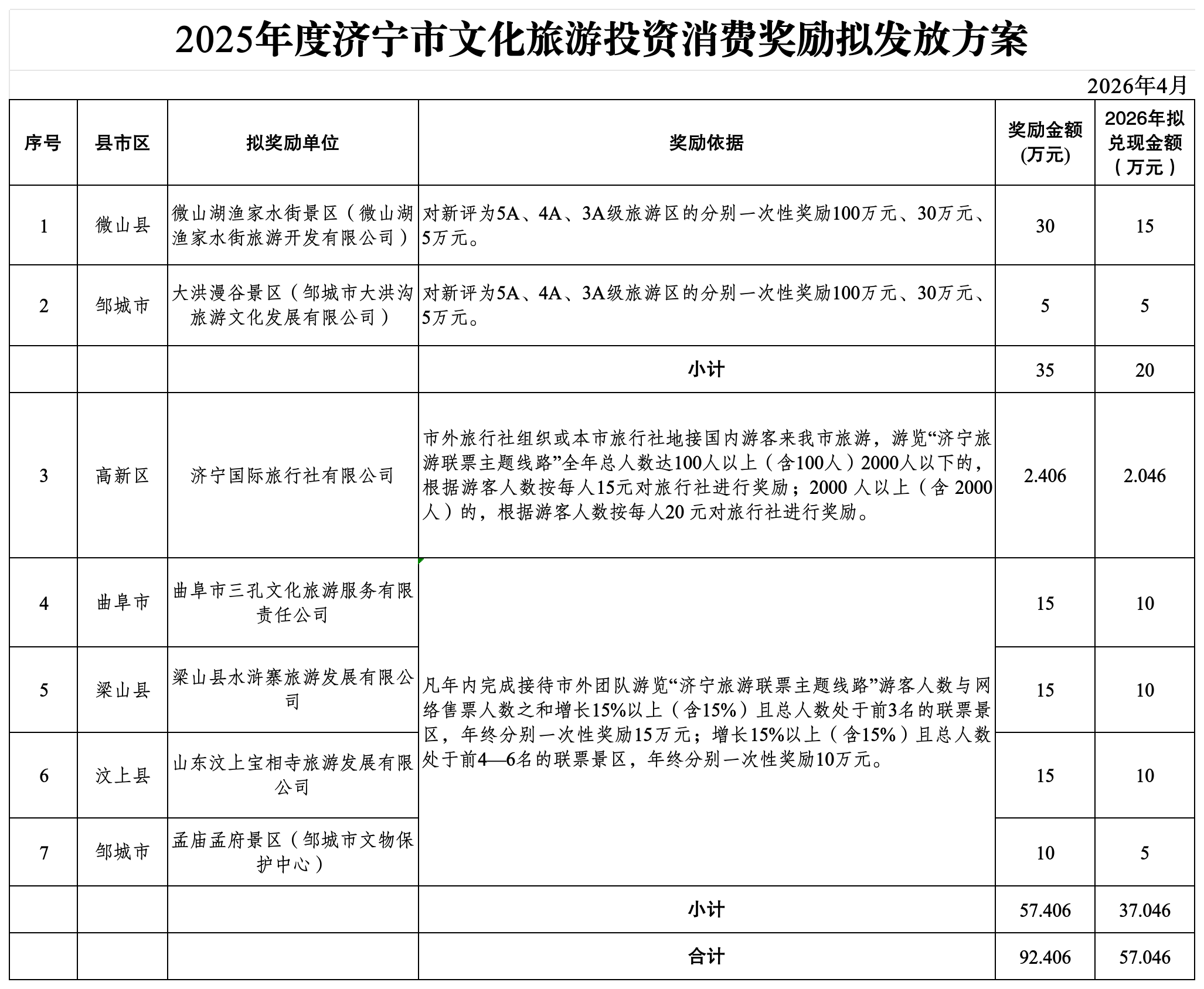 根据济宁市委办公室、市政府办公室《关于印发济宁市促进文化旅游产业发展的意见的通知》(济办发〔2021〕18号)要求,市文化和旅游局组织开展了2025年度济宁市文化旅游投资消费奖励申报工作。经企业申报、县市区审核推荐、市级终审等程序,并经市文化和旅游局党组会议研究,拟对符合2025年度济宁市文化旅游奖励资金奖励条件的项目进行奖励。结合市财政预算批复情况及工作实际,2025年度奖励资金拟分批兑现,未兑现部分视财政资金执行或2027年预算批复情况另行执行,现将资金拟发放方案予以公示。 公示期为5个工作日(2026年4月3日—4月10日)。在公示期内任何单位及个人对公示内容有异议的,应当以真实身份书面向市文化和旅游局提出,并提供必要的证明文件或材料。 联系科室: 1. 5A、4A、3A级旅游区 济宁市文化和旅游局资源开发科 联系电话:0537-2171699 2. 旅游联票主题线路创新、联票人数、景区接待人数 济宁市文化和旅游局市场推广科 联系电话:0537-2222409 附件:2025年度济宁市文化旅游投资消费奖励拟发放方案 济宁市文化和旅游局 2026年4月3日